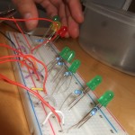 My mates and me came up with the idea of the Gorilla Chest Drummer. A simple game in which two players with hairy gorilla chest bras face each other and drum their chests to charge their Gorilla-Vigor-Meter™. When it is fully charged – three LEDs will glow, the player is able to hit the other player on his shoulder and score a point. The player who scorse three times first wins.